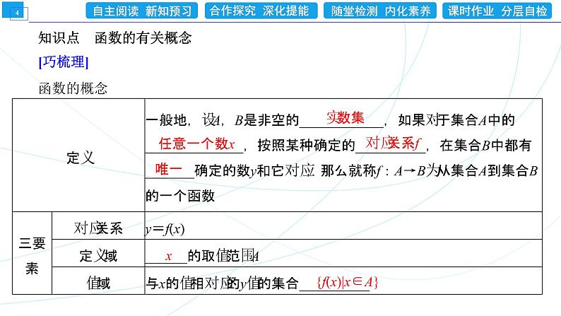 [微点拨]对函数概念的再理解(1)函数定义中强调“三性”:任意性、存在性、唯一性,即对于非空数集A中的任意一个(任意性)数x,在非空数集B中都有(存在性)唯一(唯一性)的数y与之对应.这三性只要有一个不满足,便不能构成函数.(2)y=f(x)仅仅是函数符号,不是表示“y等于f与x的乘积”,f(x)也不一定就是解析式.除f(x)外,有时还用g(x),u(x),F(x),G(x)等符号来表示函数.