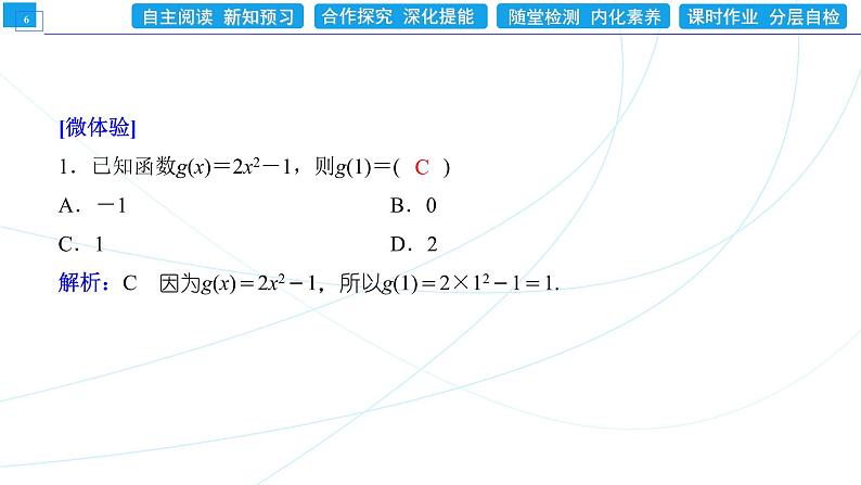 [微体验]1.已知函数g(x)=2x2-1,则g(1)=( )A.-1 B.0 C.1 D.2解析:C 因为g(x)=2x2-1,所以g(1)=2×12-1=1.
