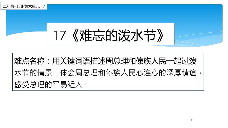 人教部编版二年级上册17 难忘的泼水节课前预习ppt课件: 这是一份人教部编版二年级上册17 难忘的泼水节课前预习ppt课件,共12页。PPT课件主要包含了会写的字,会认的字,重点字词,多音字,语段分析,段落划分等内容,欢迎下载使用。
