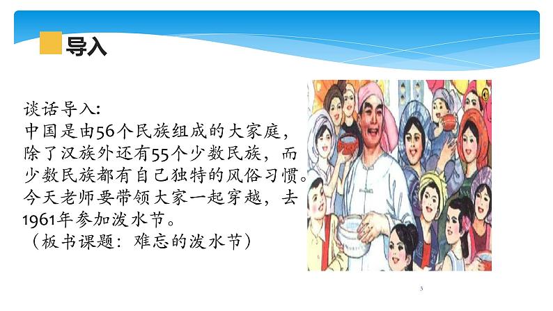 展开谈话导入:中国是由56个民族组成的大家庭,除了汉族外还有55个少数民族,而少数民族都有自己独特的风俗习惯。今天老师要带领大家一起穿越,去1961年参加泼水节。(板书课题:难忘的泼水节)