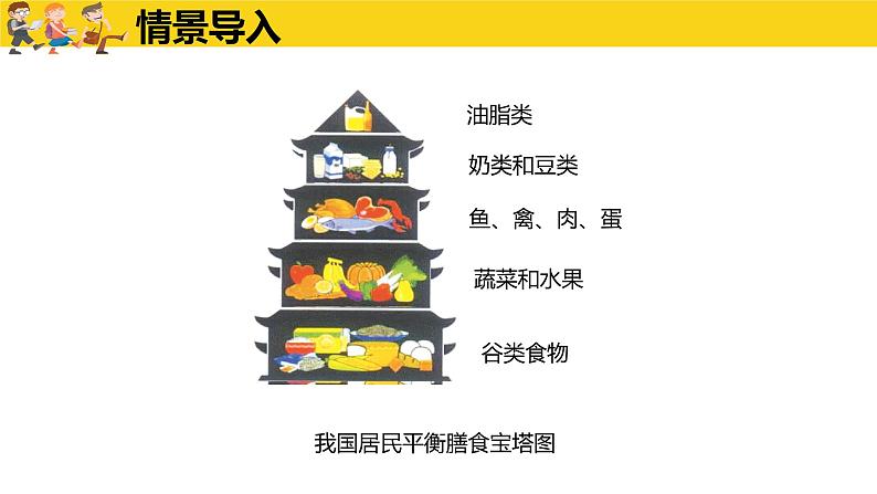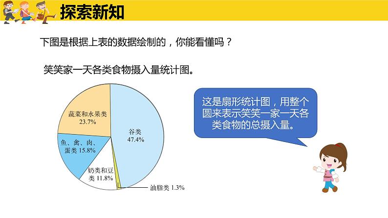 这是扇形统计图,用整个圆来表示笑笑一家一天各类食物的总摄入量。