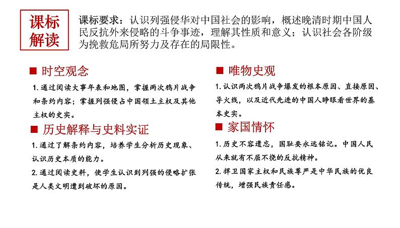 这是一份人教统编版(必修)中外历史纲要(上)第16课 两次鸦片战争图文课件ppt,共24页。PPT课件主要包含了课标解读,时空观念,鸦片战争始末,战争的背景,战争的过程,鸦片战争过程时间轴,小题狂练,拓展延伸,问题探究,战争的影响等内容,欢迎下载使用。