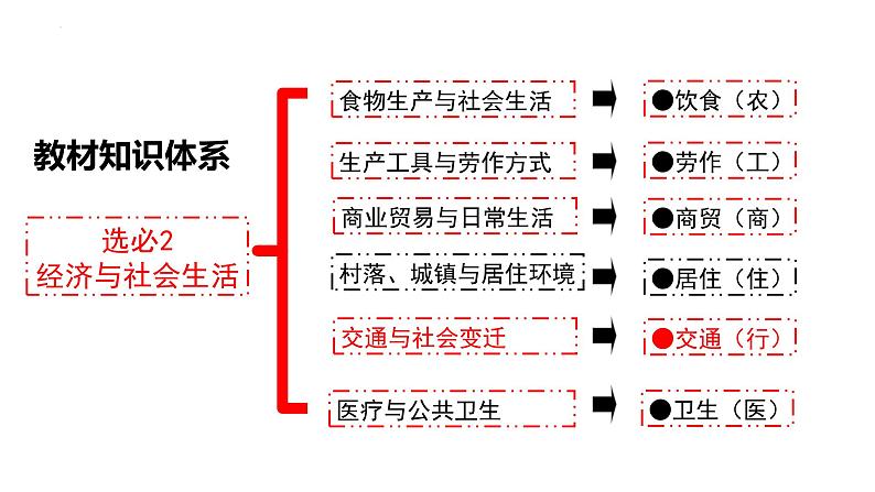 这是一份高中历史人教统编版选择性必修2 经济与社会生活第13课 现代交通运输的新变化备课课件ppt,共23页。PPT课件主要包含了选必2经济与社会生活,食物生产与社会生活,●饮食农,生产工具与劳作方式,●劳作工,商业贸易与日常生活,●商贸商,城镇与居住环境,●居住住,交通与社会变迁等内容,欢迎下载使用。