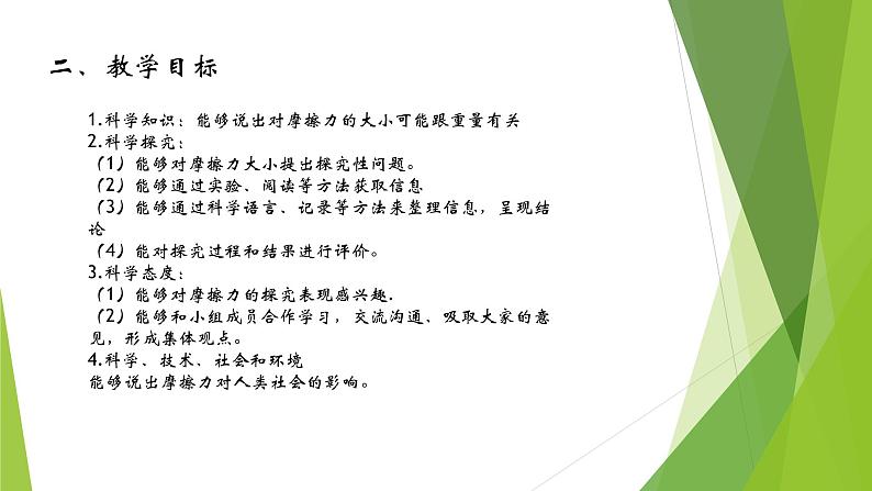 1.科学知识:能够说出对摩擦力的大小可能跟重量有关2.科学探究:(1)能够对摩擦力大小提出探究性问题。(2)能够通过实验、阅读等方法获取信息(3)能够通过科学语言、记录等方法来整理信息,呈现结论(4)能对探究过程和结果进行评价。3.科学态度:(1)能够对摩擦力的探究表现感兴趣.(2)能够和小组成员合作学习,交流沟通、吸取大家的意见,形成集体观点。4.科学、技术、社会和环境能够说出摩擦力对人类社会的影响。