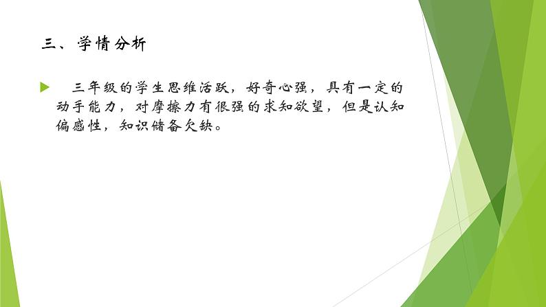 三年级的学生思维活跃,好奇心强,具有一定的动手能力,对摩擦力有很强的求知欲望,但是认知偏感性,知识储备欠缺。