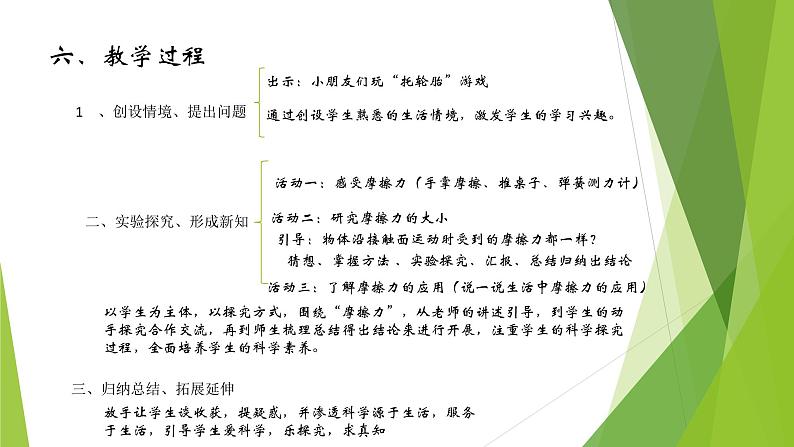 以学生为主体,以探究方式,围绕“摩擦力”,从老师的讲述引导,到学生的动手探究合作交流,再到师生梳理总结得出结论来进行开展,注重学生的科学探究过程,全面培养学生的科学素养。