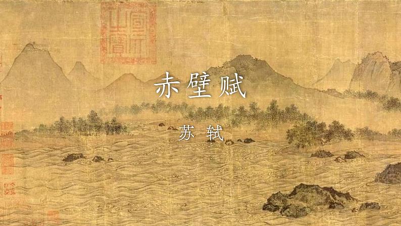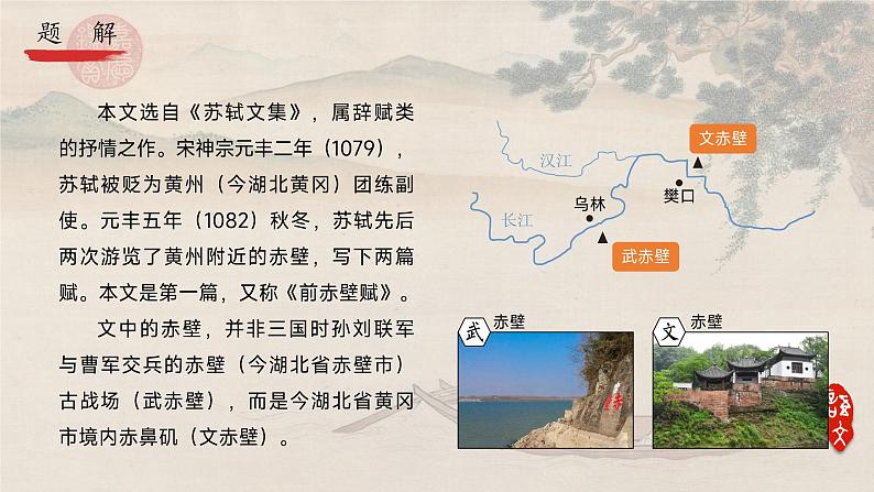 本文选自《苏轼文集》,属辞赋类的抒情之作。宋神宗元丰二年(1079),苏轼被贬为黄州(今湖北黄冈)团练副使。元丰五年(1082)秋冬,苏轼先后两次游览了黄州附近的赤壁,写下两篇赋。本文是第一篇,又称《前赤壁赋》。文中的赤壁,并非三国时孙刘联军与曹军交兵的赤壁(今湖北省赤壁市)古战场(武赤壁),而是今湖北省黄冈市境内赤鼻矶(文赤壁)。