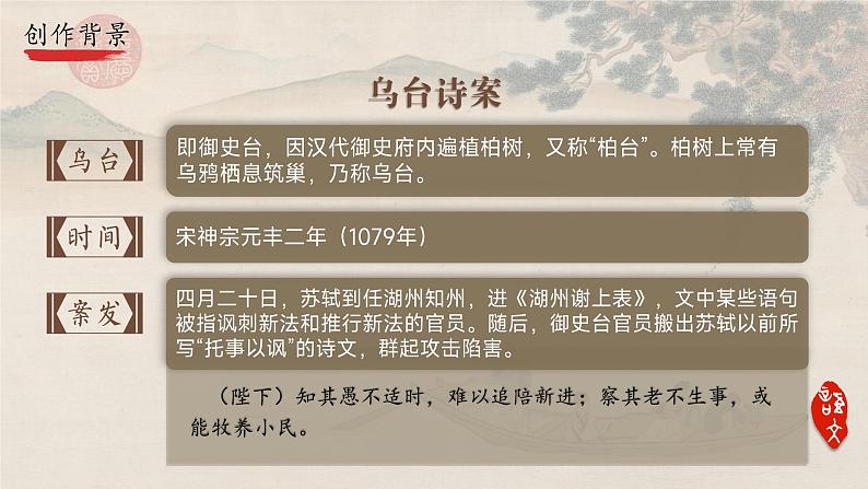 四月二十日,苏轼到任湖州知州,进《湖州谢上表》,文中某些语句被指讽刺新法和推行新法的官员。随后,御史台官员搬出苏轼以前所写“托事以讽”的诗文,群起攻击陷害。