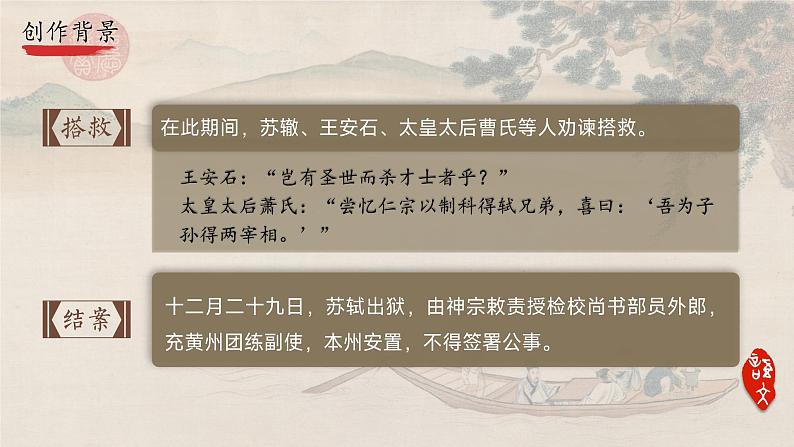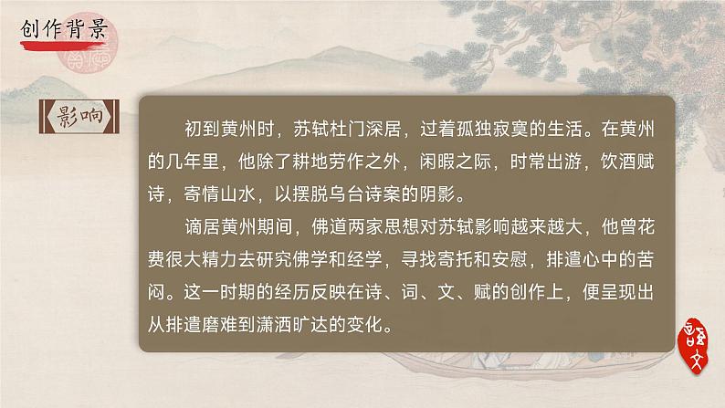 初到黄州时,苏轼杜门深居,过着孤独寂寞的生活。在黄州的几年里,他除了耕地劳作之外,闲暇之际,时常出游,饮酒赋诗,寄情山水,以摆脱乌台诗案的阴影。谪居黄州期间,佛道两家思想对苏轼影响越来越大,他曾花费很大精力去研究佛学和经学,寻找寄托和安慰,排遣心中的苦闷。这一时期的经历反映在诗、词、文、赋的创作上,便呈现出从排遣磨难到潇洒旷达的变化。