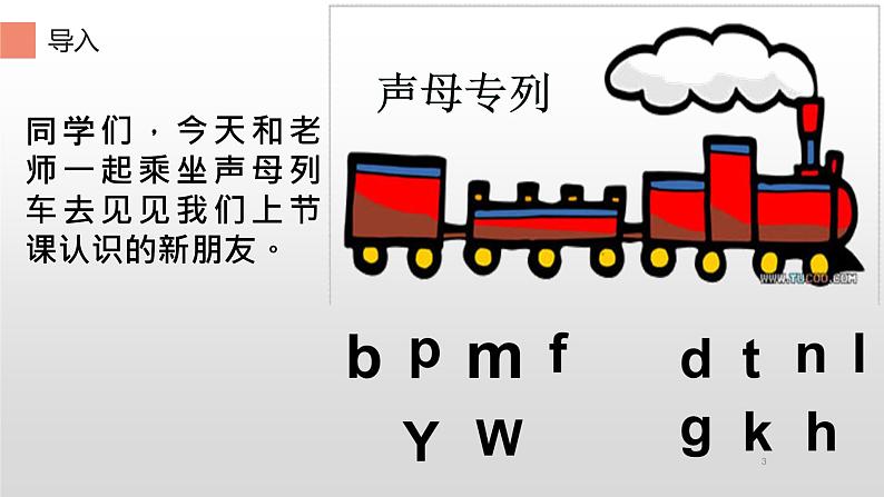 同学们,今天和老师一起乘坐声母列车去见见我们上节课认识的新朋友。