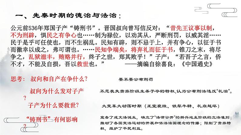 课程标准:知道中国先秦时期成文法的产生过程,以及这一时期思想家对于德治、法治关系的讨论;知道自汉起历代王朝法律、礼教并用的统治手段。