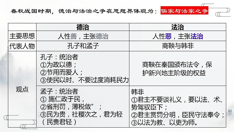 春秋战国时期,德治与法治之争在思想界体现为:儒家与法家之争