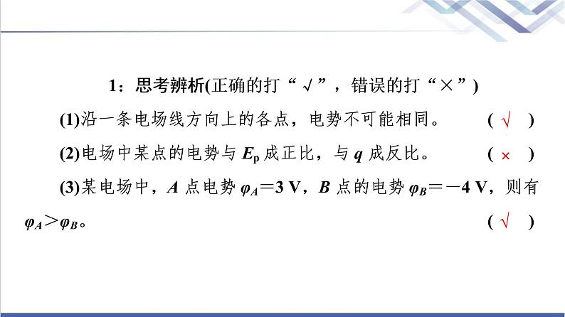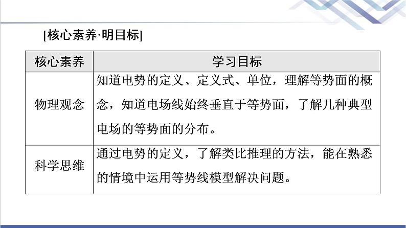 第2节 电势与等势面[核心素养·明目标]核心素养学习目标物理观念知道电势的定义、定义式、单位,理解等势面的概念,知道电场线始终垂直于等势面,了解几种典型电场的等势面的分布。科学思维通过电势的定义,了解类比推理的方法,能在熟悉的情境中运用等势线模型解决问题。科学探究会运用类比等高线来理解和探究等势面,与他人合作交流,实事求是,提高探究能力。科学态度与责任通过等势面探索,体会类比与创新在物理学研究中的重要性,体验形象思维与抽象思维的相互关联,感悟物理学内在之美,激发学习热情。知识点一 电势1.定义:电荷在电场中某点的电势能与它的电荷量之比,称为该点的电势。2.公式和单位:电势的定义公式为φA=,国际单位是伏特,符号是V。3.相对性:电势也是相对的,常取离场源电荷无穷远处的电势为零,也常选地球为零电势点。电势可以是正值,也可以是负值,没有方向,因此是标量。4.与电场线关系:沿电场线的方向电势逐渐降低。 电势是标量,有正、负,具有相对性,在同一电场中,正值高于负值。1:思考辨析(正确的打“√”,错误的打“×”)(1)沿一条电场线方向上的各点,电势不可能相同。 (√)(2)电场中某点的电势与Ep成正比,与q成反比。 (×)(3)某电场中,A点电势φA=3 V,B点的电势φB=-4 V,则有φA>φB。(√)知识点二 等势面1.定义:电场中电势相等的点构成的面。2.性质(1)在同一等势面上移动电荷,静电力不做功。(2)电场线与等势面垂直,方向由电势高的等势面指向电势低的等势面。(3)等差等势面密集处电场线密集,说明此处电场强度较大。 我们常画的等势面一般是等差等势面,即相邻两等势面间的电势的差值相等。2:思考辨析(正确的打“√”,错误的打“×”)(1)等势面上各点电势、场强均相同。 (×)(2)电荷在等势面上移动时不受电场力作用,所以不做功。 (×)3:填空如图所示,匀强电场中三点A、B、C,则三点电场强度大小关系为EA=EB=EC,电势高低关系为φC>φA>φB。 考点1 电势的理解及电势高低的判断电场线分布如图所示,电场中有a、b两点,试比较电场强度Ea和Eb的大小?电势φa与φb的高低?提示:Ea<Eb,φa>φb。1.电势的理解(1)电势的相对性:电场中某点的电势跟零电势位置的选取有关,常选取无限远处或大地的电势为零。(2)电势的固有性:电势φ=是定义式,φ的大小由电场本身决定,与试探电荷、电荷的电性及电荷量均无关。(3)电势是标量:一般选无穷远处或大地处电势为零。正值表示该点电势高于零电势点,负值表示该点电势低于零电势点。正、负只表示大小,不表示方向。2.电势高低的判断方法判断角度判断方法场源电荷正负法取无穷远处电势为零,正电荷周围电势为正值,负电荷周围电势为负值;靠近正电荷处电势高,靠近负电荷处电势低电场线方向法沿着电场线方向电势逐渐降低;逆着电场线方向电势逐渐升高电场力做功法电场力做正功,电势能减少,若为正电荷,电势降低;若为负电荷,电势升高。电场力做负功,电势能增加,若为正电荷,电势升高;若为负电荷,电势降低电势能高低法正电荷的电势能大处电势高,负电荷的电势能大处电势低 【典例1】 如图所示,电子在一条电场线上从a点运动到b点,电势能增加,试判定a、b两点电势的高低。思路点拨:(1)沿电场线方向电势逐渐降低。(2)电场力做负功,电势能增加。(3)正电荷受力方向与电场线的切线方向相同,负电荷则相反。[解析] 解法一:利用电场线的方向来判断由于电势能增加,电场力一定做负功,即电场力方向和电荷运动方向相反,由b指向a,而负电荷所受电场力的方向和场强方向相反,场强方向应是由a指向b,因此电场线的方向是由a指向b。沿着电场线的方向电势越来越低,a点电势比b点电势高。解法二:利用电势能判断正电荷在电势越高的地方电势能越大,负电荷在电势越高的地方电势能越小,而本题已知条件是负电荷在a点电势能较低,故a点电势高。[答案] a点电势比b点电势高由以上分析可知,电势高低的判断方法有多种,因此在具体应用时,可根据题目中的条件,灵活选择方法判断。[跟进训练]1.三个点电荷电场的电场线分布如图所示,图中a、b两点处的场强大小分别为Ea、Eb,电势分别为φa、φb,则下列关系正确的是( )A.Ea>Eb,φa>φbB.Ea<Eb,φa<φbC.Ea>Eb,φa<φbD.Ea<Eb,φa>φbC [由图可以看出a处电场线更密,所以Ea>Eb;根据对称性,a处的电势应与右侧负电荷附近对称点的电势相等,再根据沿电场线方向电势降低可以判定φb>φa,故C正确。] 考点2 等势面的理解与计算如图所示为匀强电场中的等势面,把电荷从同一等势面上的A点移到B点时,电荷的电势能是否变化?静电力做功情况如何?等势面与电场线有何关系?提示:不变化,不做功,垂直。1.等势面的特点(1)在同一等势面上任意两点间移动电荷,电场力不做功。(2)在空间中两等势面不相交。(3)电场线方向总是和等势面垂直,且从电势较高的等势面指向电势较低的等势面。(4)在电场线密集的地方,等差等势面密集;在电场线稀疏的地方,等差等势面稀疏。(5)等势面是为了描述电场的性质而假想的面。(6)等势面的分布与电势零点的选取无关。2.几种常见电场的等势面等势面图形特点点电荷以点电荷为球心的一簇球面等量异种点电荷两簇对称的曲面等量同种点电荷两簇对称的曲面匀强电场垂直于电场线的一簇平面形状不规则的带电导体不规则曲面【典例2】 空间中P、Q两点处各固定