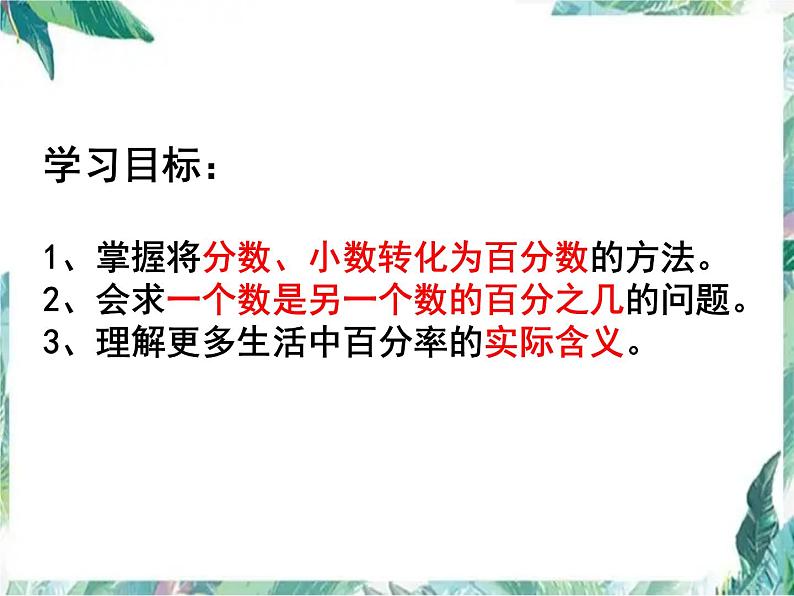 学习目标:1、掌握将分数、小数转化为百分数的方法。2、会求一个数是另一个数的百分之几的问题。3、理解更多生活中百分率的实际含义。