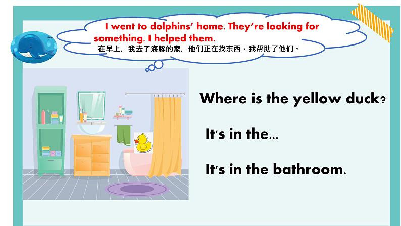 I went t dlphins’ hme. They’re lking fr smething. I helped them. 在早上,我去了海豚的家,他们正在找东西,我帮助了他们。