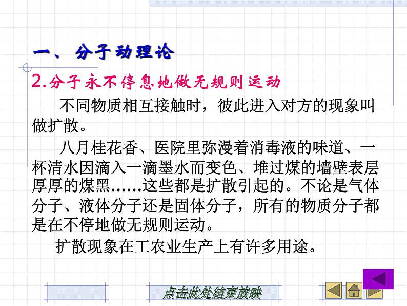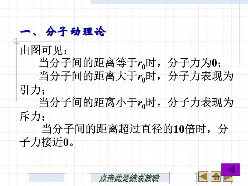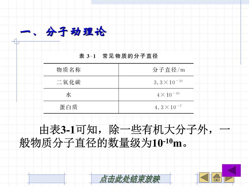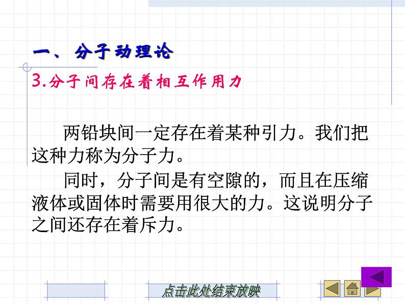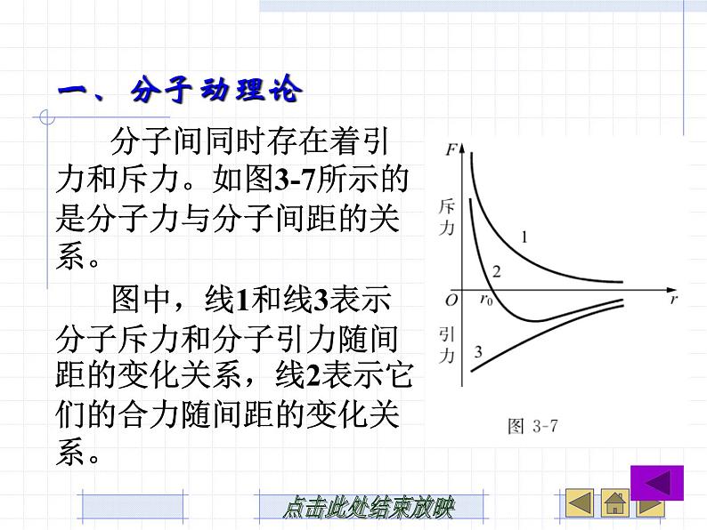 第三单元 热现象及应用第一章 分子动理论一、分子动理论1.物质是由大量分子组成的 如图3-2所示的是用扫描隧道显微镜拍摄的溴原子的照片。12个溴原子(橙色)排列成一个环状结构的分子。由图可知,分子有一定的大小,分子间存在空隙,分子的排列有特定的结构。 一、分子动理论 由表3-1可知,除一些有机大分子外,一般物质分子直径的数量级为10-10m。 一、分子动理论2.分子永不停息地做无规则运动 不同物质相互接触时,彼此进入对方的现象叫做扩散。 八月桂花香、医院里弥漫着消毒液的味道、一杯清水因滴入一滴墨水而变色、堆过煤的墙壁表层厚厚的煤黑……这些都是扩散引起的。不论是气体分子、液体分子还是固体分子,所有的物质分子都是在不停地做无规则运动。 扩散现象在工农业生产上有许多用途。一、分子动理论3.分子间存在着相互作用力 两铅块间一定存在着某种引力。我们把这种力称为分子力。 同时,分子间是有空隙的,而且在压缩液体或固体时需要用很大的力。这说明分子之间还存在着斥力。一、分子动理论 分子间同时存在着引力和斥力。如图3-7所示的是分子力与分子间距的关系。 图中,线1和线3表示分子斥力和分子引力随间距的变化关系,线2表示它们的合力随间距的变化关系。一、分子动理论由图可见: 当分子间的距离等于r0时,分子力为0; 当分子间的距离大于r0时,分子力表现为引力; 当分子间的距离小于r0时,分子力表现为斥力; 当分子间的距离超过直径的10倍时,分子力接近0。二、温度1.温度 物质由分子组成,温度反映物体的冷热程度。 墨水在温度高的水中扩散得快。扩散得快表明分子做无规则运动剧烈,这说明分子的无规则运动与温度有关。通常把分子的无规则运动称为热运动。二、温度 做热运动的分子也具有动能。在热现象的研究中,关注的是分子动能的平均值,即分子的平均动能。 研究表明,温度升高,分子的热运动加剧,分子的平均动能增加;温度降低,分子热运动变慢,分子的平均动能减小。 温度是大量分子做无规则运动的分子平均动能的标志。这就是温度的微观意义。二、温度 2.温标 温标是为量度物体温度的高低而对测温标尺的零点和分度法所作的规定。只有采用相同的温标,才能用数值来比较不同物体的温度。 常用的是3种温标,即摄氏温标、华氏温标和热力学温标。二、温度 在日常生活中,一般用摄氏温标,用t表示,单位是摄氏度(℃); 在科学研究中,常使用热力学温标,用T表示,单位是开[尔文](K)。热力学温标与摄氏温标之间的换算关系为: 二、温度 3.温度计 温度计是测温仪器的总称。常用的液体温度计一般有3种:酒精温度计、水银温度计和煤油温度计。它们都是利用热胀冷缩的原理制成的。 酒精温度计 它的工作物质是酒精。在标准大气压下,酒精凝固点是-114℃,所以在北方寒冷的季节通常会使用酒精温度计来测量温度。水银的凝固点是-39℃,在寒冷地区会因为气温太低而使水银凝固,无法进行正常的温度测量。二、温度 水银温度计 医用体温计的工作物质是水银。由于人体温度的变化在35~42℃,所以体温计的刻度通常是35~42℃,每度的范围又分成10份,因此体温计可精确到0.1℃。一般的水银温度计可以测到300℃以上的高温。 煤油温度计 它的工作物质是煤油。煤油的沸点一般高于150℃,凝固点低于-30℃。煤油温度计可比酒精温度计测更高的温度。三、气体的压强 从分子动理论的观点看来,气体的压强就是大量气体分子作用在器壁单位面积上的平均作用力。 气体分子的平均动能越大,气体分子越密,对单位面积器壁产生的压力就越大,气体的压强就越大。 在国际单位制中,压强的单位是帕斯卡,简称帕,符号Pa。三、气体的压强 气体的压强用气压计来测量,常见的气压计有水银气压计、金属盒气压计和电子气压计等。 水银气压计是利用托里拆利原理来测定大气压的一种装置。水银气压计准确性高,但体积偏大,易破损,携带不方便,一般适用于气象、教学、科研。三、气体的压强 如图所示的金属盒(无液)气压计体积小巧、携带方便,但准确性略差,一般用在一些只需要显示气压的设备上,如医用氧气瓶、大煤气罐、空气压缩机、爆米花机和锅炉等。 三、气体的压强 目前,一般用电子气压计(如图所示)替代原有的指针式气压计。电子气压计采用气压传感器和低功耗的电子芯片以及高精密电子器件组成,它的显著优点是操作简便。四、热力学能1.分子动能和势能 做热运动的分子具有的动能叫做分子动能。通过前面的扩散实验可知,温度越高,分子热运动越剧烈,分子平均动能越大。 与此相类似,分子之间存在着分子力,分子之间也有势能,这种势能称为分子势能。分子势能的大小与分子间的距离有关。四、热力学能2.热力学能 物体内所有的分子动能和分子势能的总和,叫做物体的热力学能。 一切物体都是由永不停息地做无规则热运动并且相互作用的分子组成的,因此任何物体都具有热力学能。第二章 能量守恒定律一、热力学第一定律1.做功与热力学能 如图3-14所示的是空气压缩引火仪,里面预先放一小块浸了乙醚的棉花,用手掌迅速地拍打活塞柄,推动活塞快速向下,可以观察到棉花燃烧起来了。一、热力学第一定律 夏天,手持杀虫气雾剂罐喷洒时,能感觉到气罐变凉。这是因为气罐内的压缩气体在喷出过程