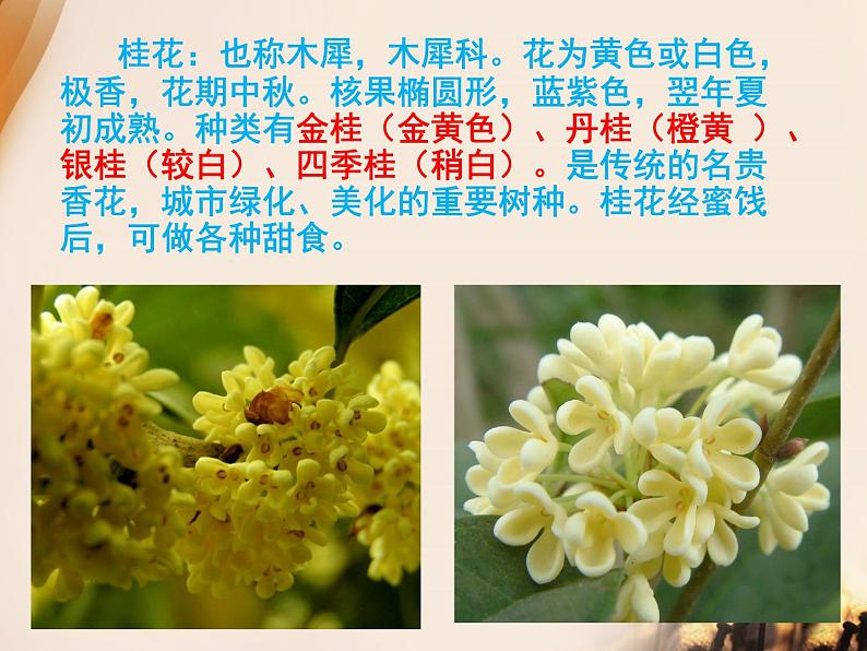 桂花:也称木犀,木犀科。花为黄色或白色,极香,花期中秋。核果椭圆形,蓝紫色,翌年夏初成熟。种类有金桂(金黄色)、丹桂(橙黄 )、银桂(较白)、四季桂(稍白)。是传统的名贵香花,城市绿化、美化的重要树种。桂花经蜜饯后,可做各种甜食。