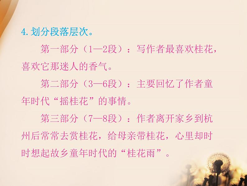 4.划分段落层次。 第一部分(1—2段):写作者最喜欢桂花,喜欢它那迷人的香气。 第二部分(3—6段):主要回忆了作者童年时代“摇桂花”的事情。 第三部分(7—8段):作者离开家乡到杭州后常常去赏桂花,给母亲带桂花,心里却时时想起故乡童年时代的“桂花雨”。