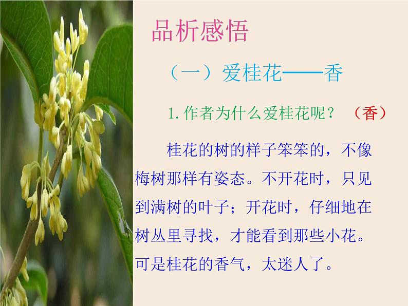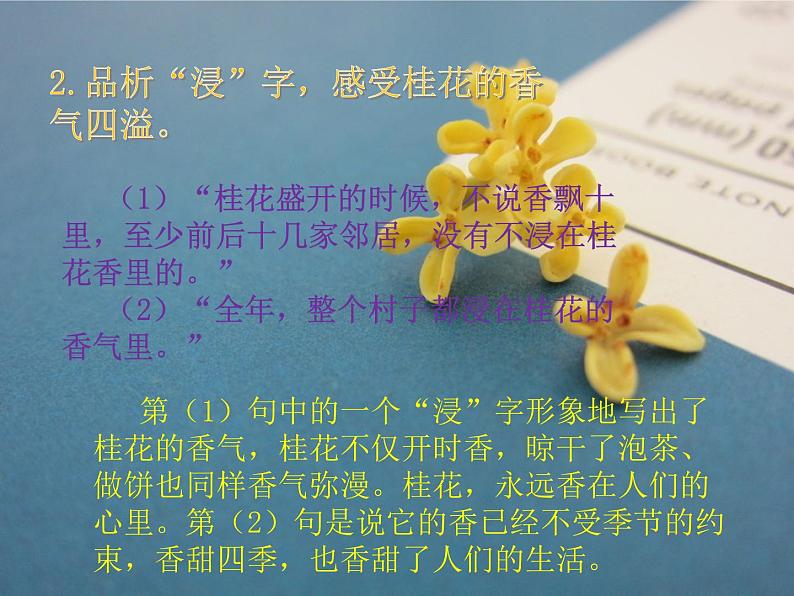 第(1)句中的一个“浸”字形象地写出了桂花的香气,桂花不仅开时香,晾干了泡茶、做饼也同样香气弥漫。桂花,永远香在人们的心里。第(2)句是说它的香已经不受季节的约束,香甜四季,也香甜了人们的生活。