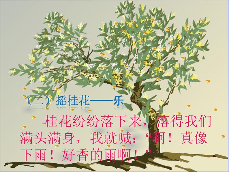 2.从具体描写作者摇桂花时的动作中,你体会到什么? “抱”“摇”等动作和欢乐的叫喊表现了“我”摇桂花时的兴奋、忙碌与快乐。作者将飘落的桂花看作香甜的桂花雨,言语中充满了陶醉和欢喜。
