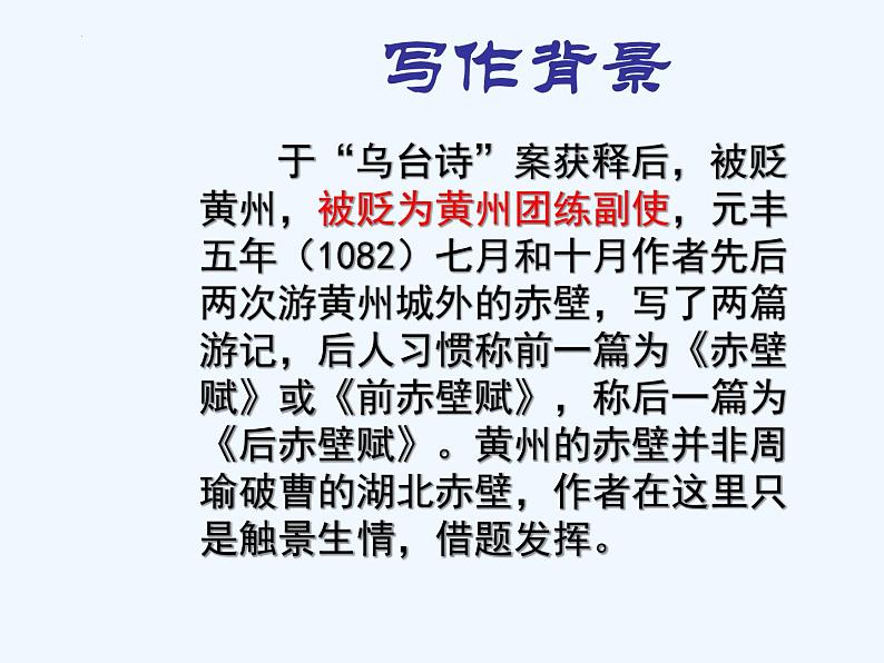 于“乌台诗”案获释后,被贬黄州,被贬为黄州团练副使,元丰五年(1082)七月和十月作者先后两次游黄州城外的赤壁,写了两篇游记,后人习惯称前一篇为《赤壁赋》或《前赤壁赋》,称后一篇为《后赤壁赋》。黄州的赤壁并非周瑜破曹的湖北赤壁,作者在这里只是触景生情,借题发挥。