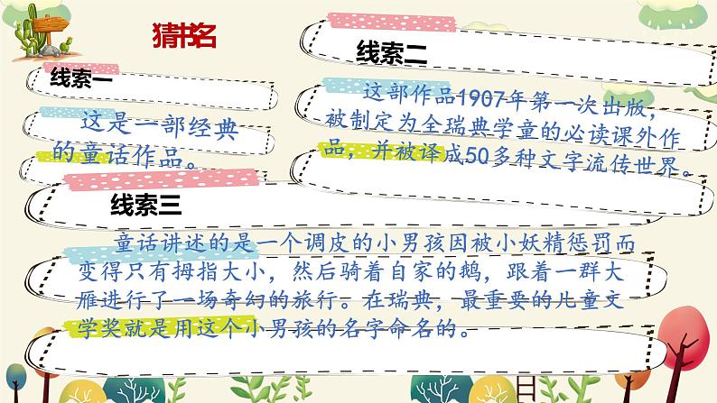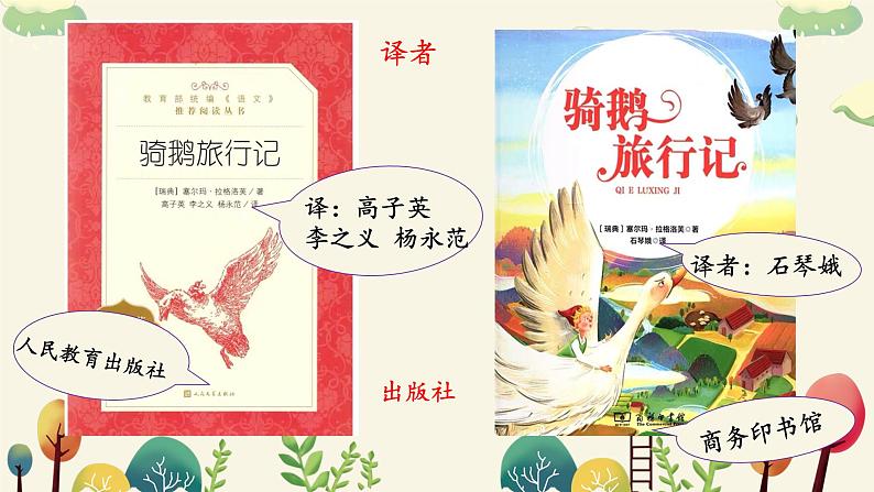 骑鹅看“历险” 对于尼尔斯来说,骑鹅旅行试一次有趣且美妙之旅。关于“历险”的文学作品有很多,你再读读《鲁滨逊漂流记》《汤姆索亚历险记》《爱丽丝漫游奇境》,思考:一部成功的“历险”作品要吸引读者,应该具备哪些要素呢?