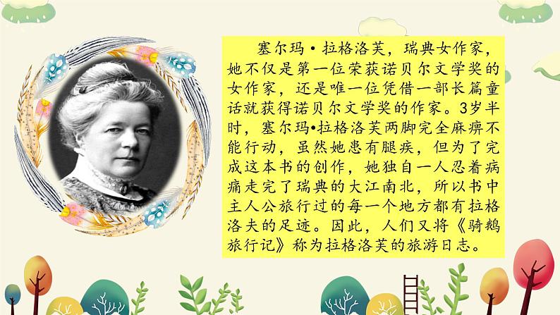 塞尔玛·拉格洛芙,瑞典女作家,她不仅是第一位荣获诺贝尔文学奖的女作家,还是唯一位凭借一部长篇童话就获得诺贝尔文学奖的作家。3岁半时,塞尔玛•拉格洛芙两脚完全麻痹不能行动,虽然她患有腿疾,但为了完成这本书的创作,她独自一人忍着病痛走完了瑞典的大江南北,所以书中主人公旅行过的每一个地方都有拉格洛夫的足迹。因此,人们又将《骑鹅旅行记》称为拉格洛芙的旅游日志。