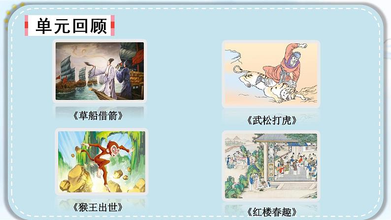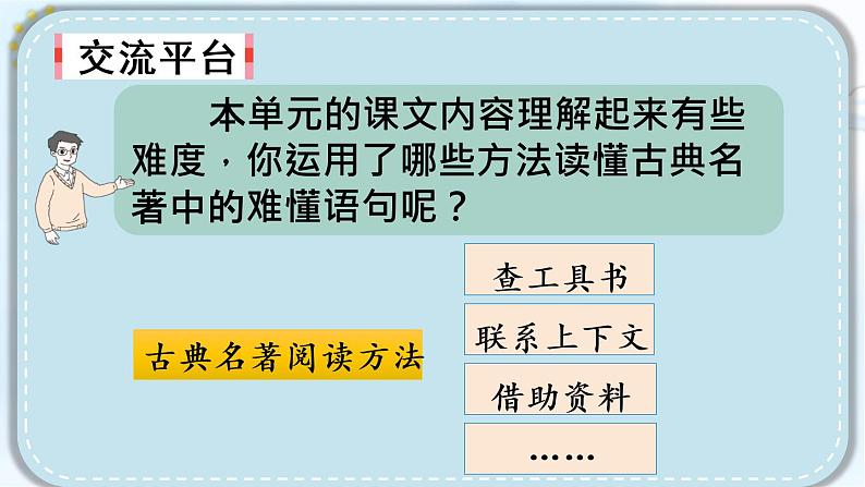 人教部编版五年级下册语文园地优秀ppt课件: 这是一份人教部编版五年级下册语文园地优秀ppt课件,共51页。PPT课件主要包含了单元回顾,交流平台,古典名著阅读方法,借助资料,联系上下文,查工具书,你还知道哪些方法,猴王出世,演练台,概括出选段的意思等内容,欢迎下载使用。
