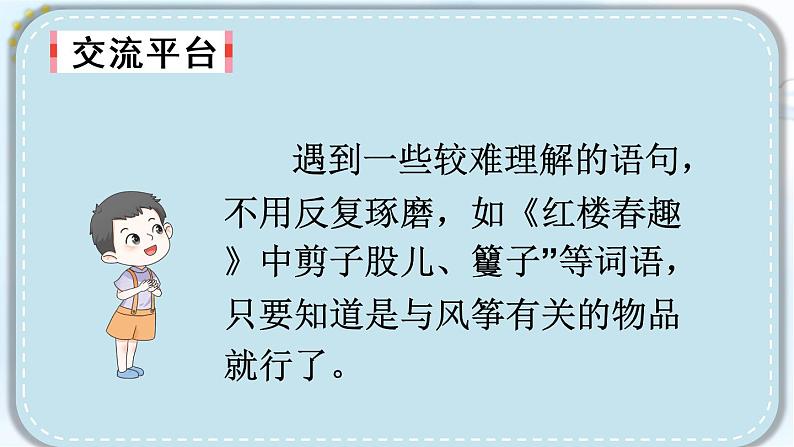 遇到一些较难理解的语句,不用反复琢磨,如《红楼春趣》中剪子股儿、籰子”等词语,只要知道是与风筝有关的物品就行了。