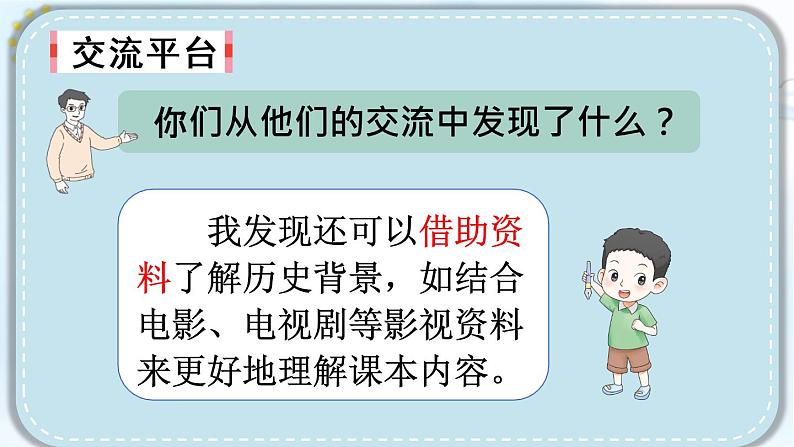 我发现还可以借助资料了解历史背景,如结合电影、电视剧等影视资料来更好地理解课本内容。