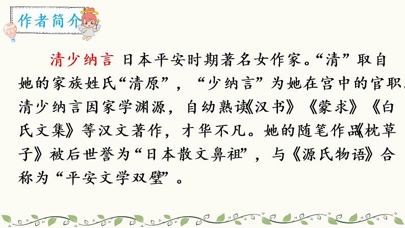 清少纳言 日本平安时期著名女作家。“清”取自她的家族姓氏“清原”,“少纳言”为她在宫中的官职。清少纳言因家学渊源,自幼熟读《汉书》《蒙求》《白氏文集》等汉文著作,才华不凡。她的随笔作品《枕草子》被后世誉为“日本散文鼻祖”,与《源氏物语》合称为“平安文学双璧”。