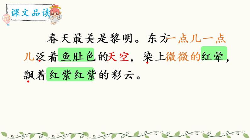 春天最美是黎明。东方一点儿一点儿泛着鱼肚色的天空,染上微微的红晕,飘着红紫红紫的彩云。