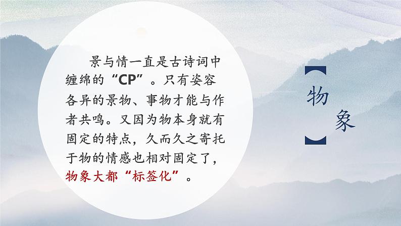 景与情一直是古诗词中缠绵的“CP”。只有姿容各异的景物、事物才能与作者共鸣。又因为物本身就有固定的特点,久而久之寄托于物的情感也相对固定了,物象大都“标签化”。