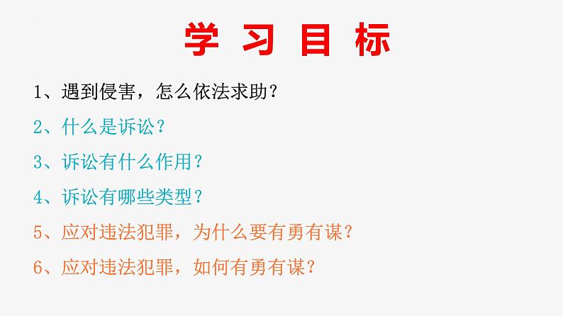这是一份初中政治 (道德与法治)人教部编版八年级上册善用法律教学ppt课件,共24页。PPT课件主要包含了3善用法律,学习目标,遇到侵害依法求助,有勇有谋应对违法犯罪等内容,欢迎下载使用。