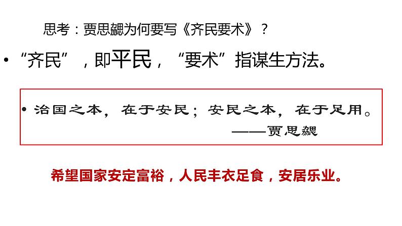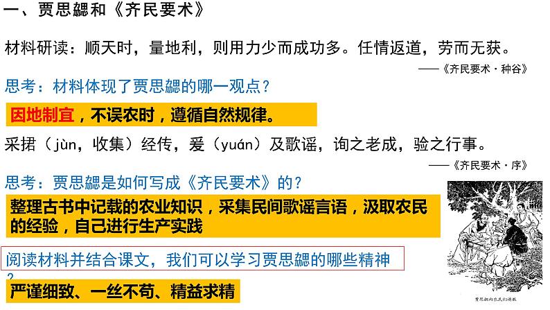 材料研读:顺天时,量地利,则用力少而成功多。任情返道,劳而无获。 ——《齐民要术·种谷》思考:材料体现了贾思勰的哪一观点?采捃(jùn,收集)经传,爰(yuán)及歌谣,询之老成,验之行事。——《齐民要术·序》 思考:贾思勰是如何写成《齐民要术》的?