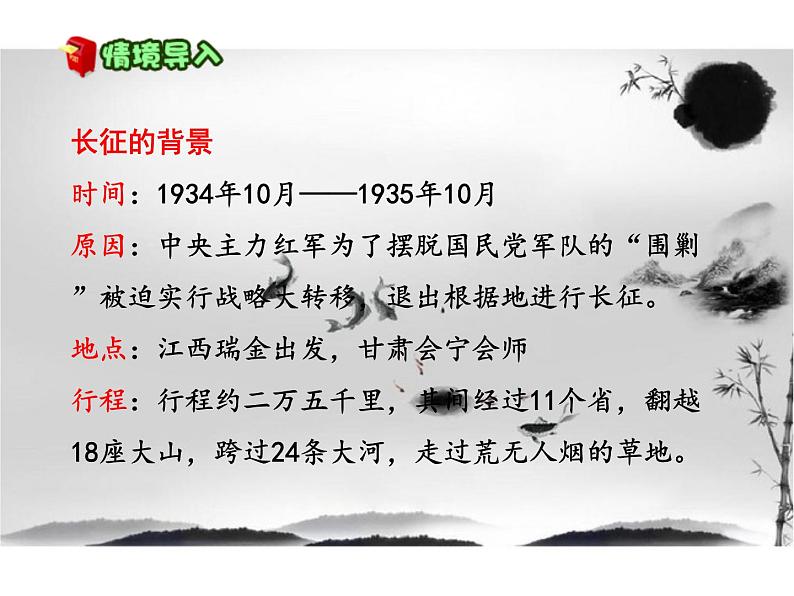 这是一份小学语文人教部编版六年级上册5 七律·长征教课ppt课件,共33页。PPT课件主要包含了长征的背景,长征的意义,写作背景,笔直很直,“远征”,“难”,“五岭”,“乌蒙”,逶迤延绵不断,腾突出奔腾的气势等内容,欢迎下载使用。