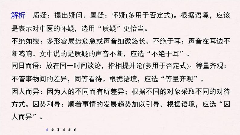 解析 质疑:提出疑问。置疑:怀疑(多用于否定式)。根据语境,应该是表示对中医的怀疑,选用“质疑”更恰当。不绝如缕:多形容局势危急或声音细微悠长。不绝于耳:声音在耳边不断鸣响。文中说的是质疑的声音不断,应选“不绝于耳”。同日而语:放在同一时间谈论,指相提并论(多用于否定式)。等量齐观:不管事物间的差异,同等看待。根据语境,应选“等量齐观”。因人而异:因为人的不同而有所差异;根据不同的对象采取不同的对待方式。因势利导:顺着事情的发展趋势加以引导。根据语境,应选“因人而异”。