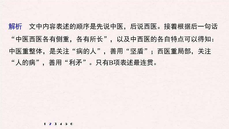 解析 文中内容表述的顺序是先说中医,后说西医。接着根据后一句话“中医西医各有侧重,各有所长”,以及中西医的各自特点可以得知:中医重整体,是关注“病的人”,善用“坚盾”;西医重局部,关注“人的病”,善用“利矛”。只有B项表述最连贯。