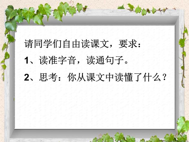 展开请同学们自由读课文,要求:1、读准字音,读通句子。2、思考:你从课文中读懂了什么?