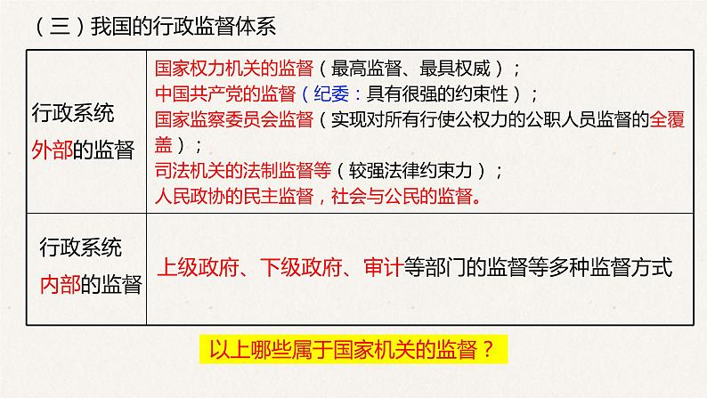这是一份4.1 政府的权力:依法行使 课件2023届高考政治一轮复习人教版必修二政治生活,共26页。PPT课件主要包含了考情分析,行政系统外部的监督,行政系统内部的监督,易错知识辨析,体验高考,答题模板,政府的工作原则,政府的职能,政府的威信,政府依法行政等内容,欢迎下载使用。