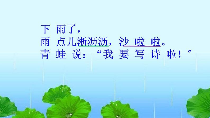 展开下 雨了,雨 点儿淅沥沥,沙 啦 啦。青 蛙 说:“我 要 写 诗 啦!〞