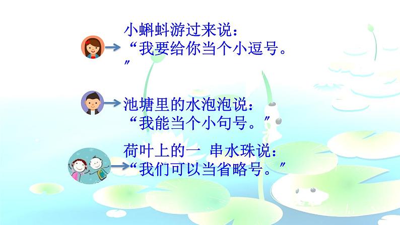 小蝌蚪游过来说:“我要给你当个小逗号。〞池塘里的水泡泡说:“我能当个小句号。〞
