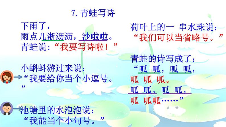 小学语文人教部编版一年级上册7 青蛙写诗教课内容课件ppt: 这是一份小学语文人教部编版一年级上册7 青蛙写诗教课内容课件ppt,共10页。PPT课件主要包含了一串水珠,青蛙写诗,水泡像句号,一串水珠像省略号,蝌蚪像逗号等内容,欢迎下载使用。