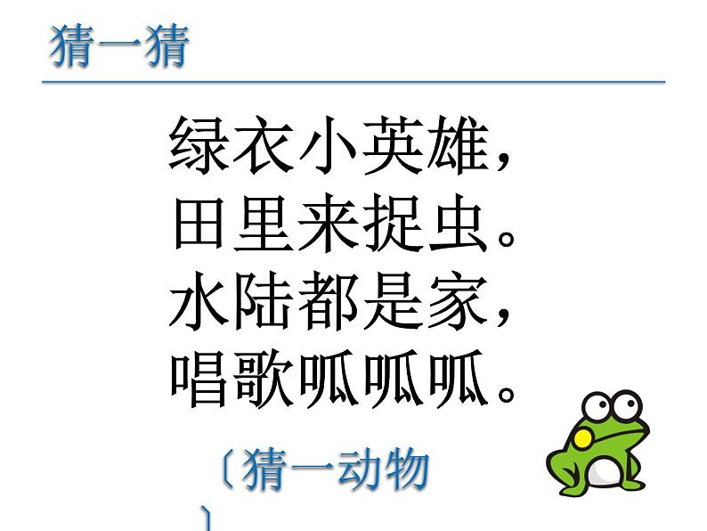 展开绿衣小英雄, 田里来捉虫。 水陆都是家, 唱歌呱呱呱。