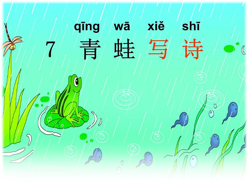 下雨了,雨点儿淅沥沥,沙啦啦。青蛙说:“我要写诗啦!〞