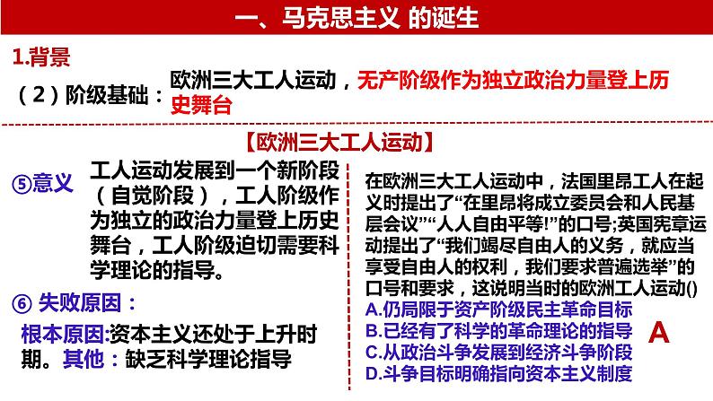 这是一份第31讲 马克思主义的诞生与传播课件--2023届高三统编版(2019)历史一轮复习,共29页。PPT课件主要包含了马克思主义的诞生,1经济基础,2阶级基础,欧洲三大工人运动,世纪三四十年代,⑤意义,⑥失败原因,①英法的空想社会主义,3思想基础,英法空想社会主义等内容,欢迎下载使用。