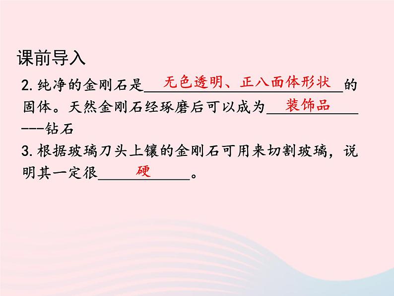 2.纯净的金刚石是 的固体。天然金刚石经琢磨后可以成为 。 ---钻石3.根据玻璃刀头上镶的金刚石可用来切割玻璃,说明其一定很 。