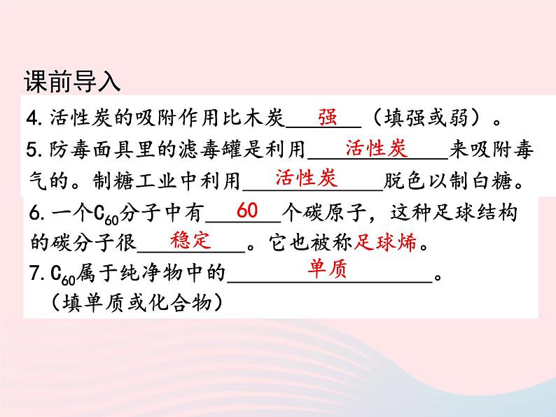 4.活性炭的吸附作用比木炭 (填强或弱)。5.防毒面具里的滤毒罐是利用 来吸附毒气的。制糖工业中利用 脱色以制白糖。