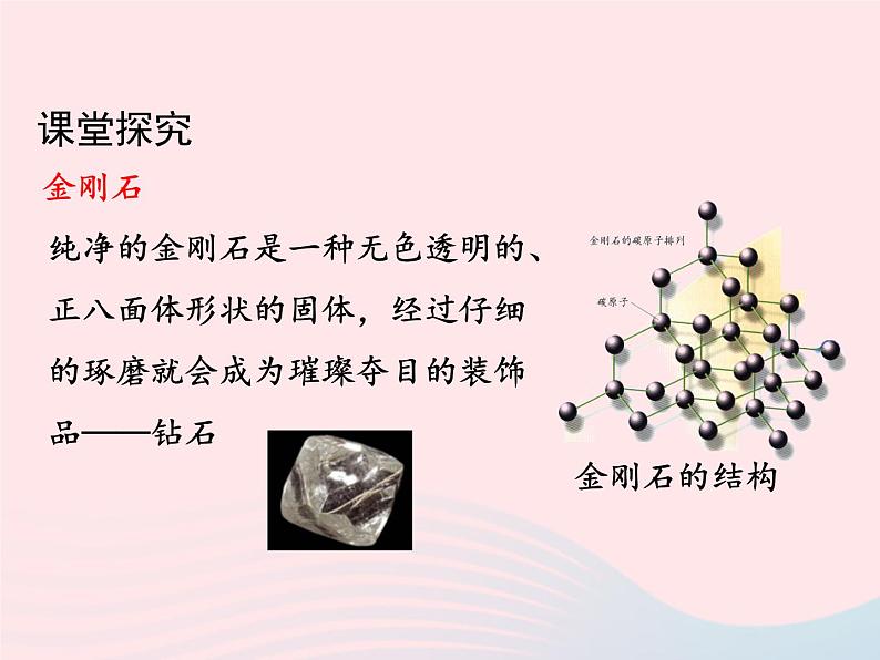 纯净的金刚石是一种无色透明的、正八面体形状的固体,经过仔细的琢磨就会成为璀璨夺目的装饰品——钻石