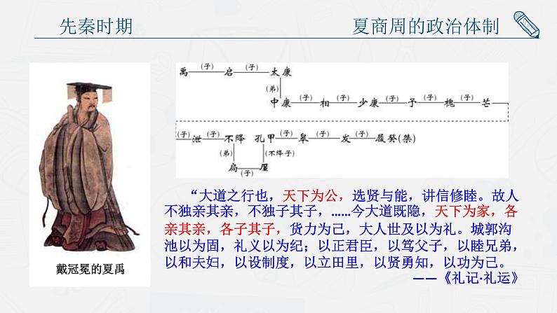这是一份高中历史第1课 中国古代政治体制的形成与发展课文配套课件ppt,共22页。PPT课件主要包含了高中历史选择性必修一,先秦时期,夏商周的政治体制,夏商时期的政治制度,分封制,宗法制,家国一体,互为表里,相互依存,礼乐制等内容,欢迎下载使用。